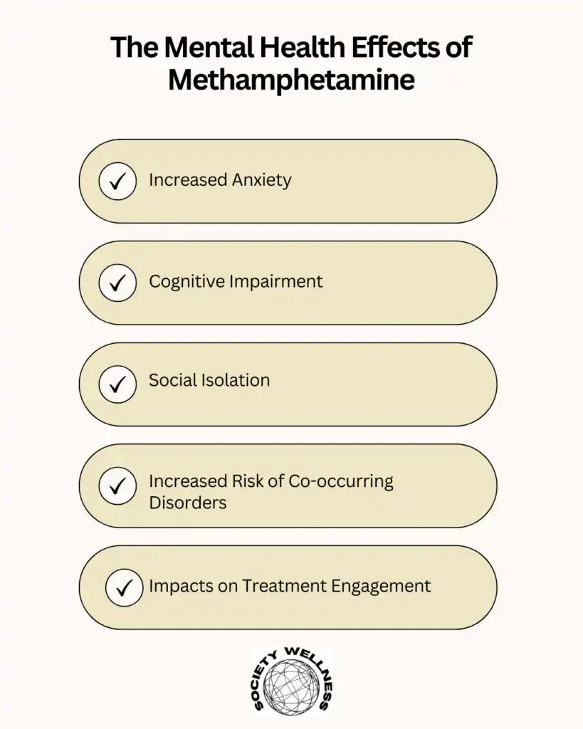 Methamphetamine use can lead to increased anxiety, paranoia, depression, and cognitive impairment. The cycle of use and withdrawal can exacerbate these mental health issues, making recovery more challenging.